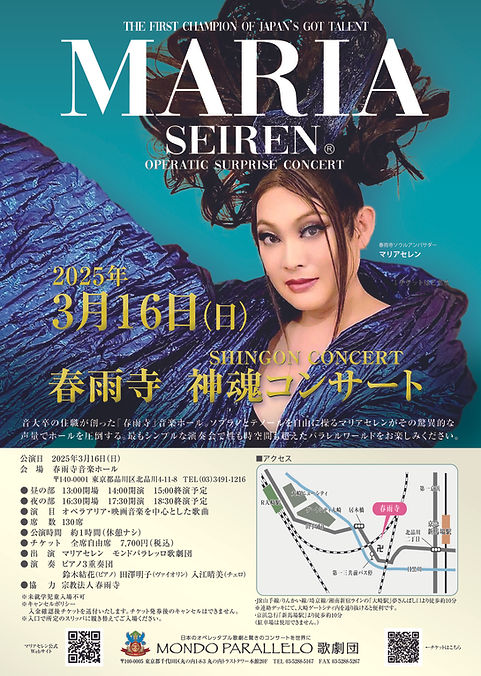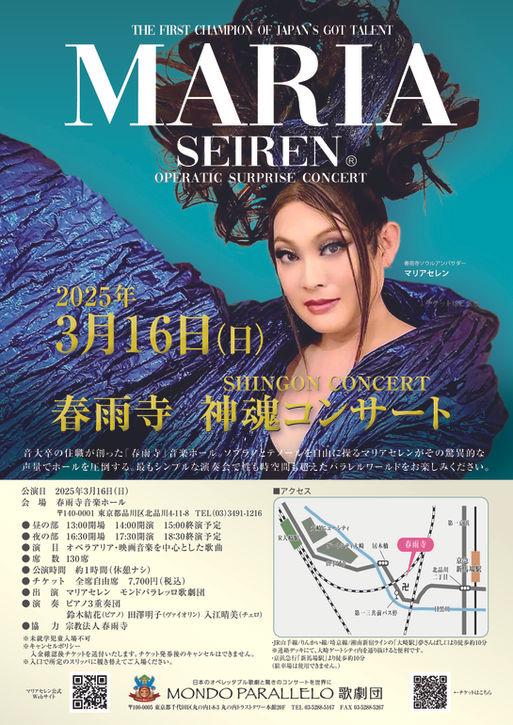 音大卒の住職が創った「春雨寺」音楽ホール。ソプラノとテノールを自由に操るマリアセレンがその驚異的な声量でホールを圧倒する。最もシンプルな演奏会で性も時空間も超えたパラレルワールドをお楽しみください